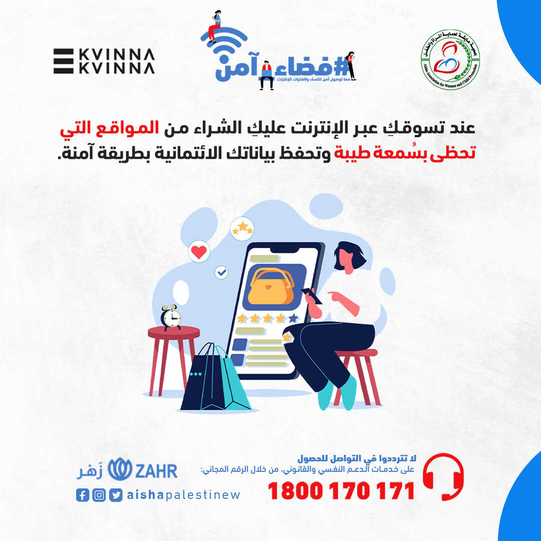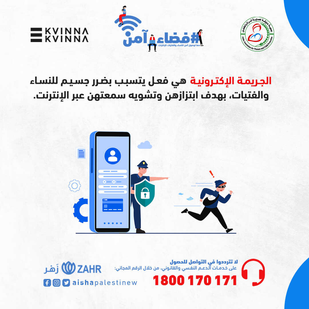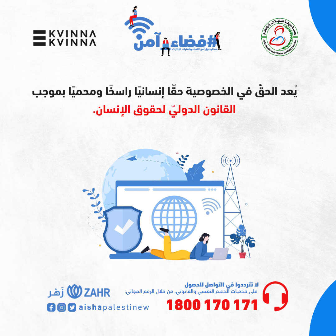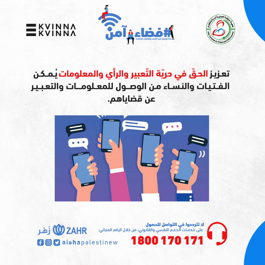 لأن الحقوق الّتي يتمتّع بها الناس خارج نطاق الإنترنت هي ذات الحقوق التي يجب حمايتها داخل نطاق الإنترنت، أطلفنا في جمعية عايشة لحماية المرأة والطفل حملة فضاء آمن ضمن أنشطة مشروع "إشراك الرجال والنساء في معالجة العنف المبني على النوع الاجتماعي والمساواة بين الجنسين في قطاع غزة، بتمويل من Kvinna til Kvinna.