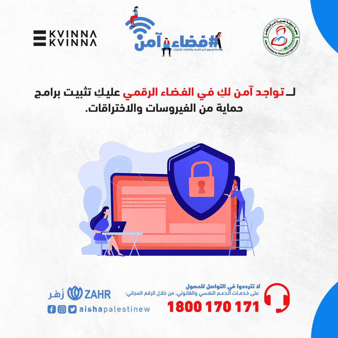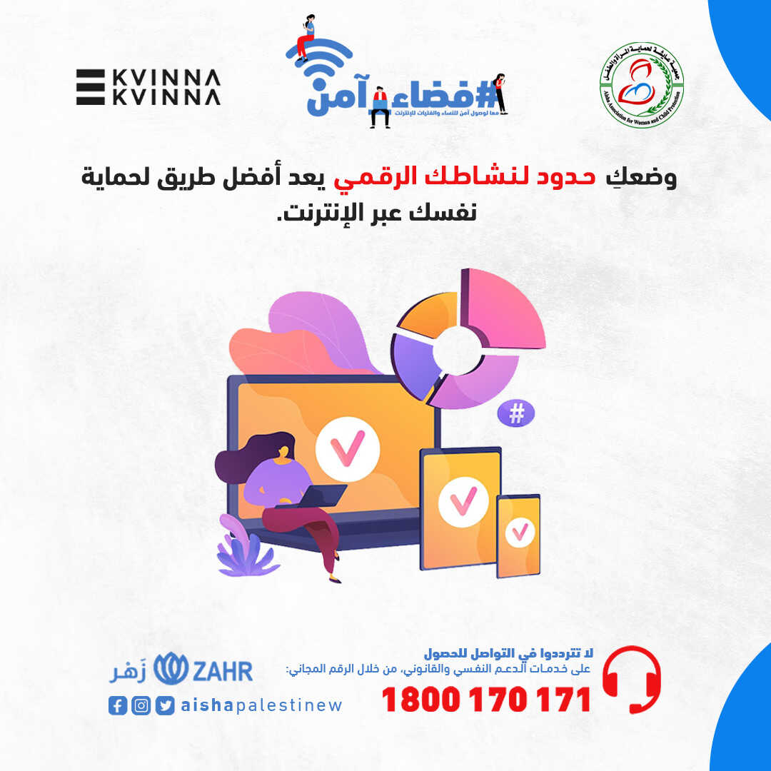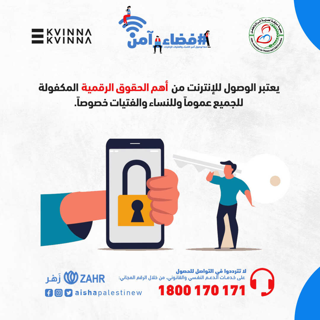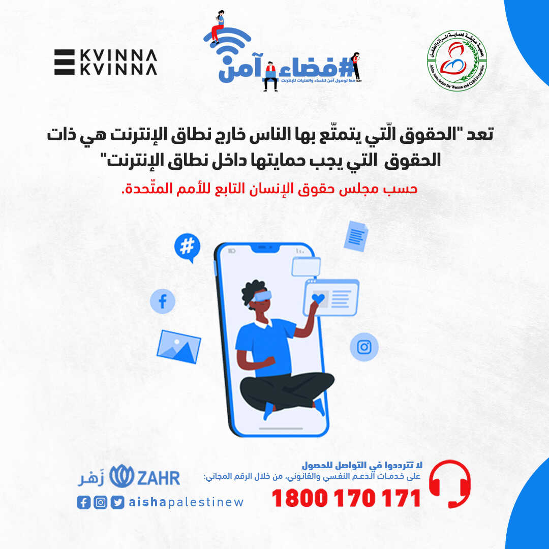 لأن الحقوق الّتي يتمتّع بها الناس خارج نطاق الإنترنت هي ذات الحقوق التي يجب حمايتها داخل نطاق الإنترنت، أطلفنا في جمعية عايشة لحماية المرأة والطفل حملة فضاء آمن ضمن أنشطة مشروع "إشراك الرجال والنساء في معالجة العنف المبني على النوع الاجتماعي والمساواة بين الجنسين في قطاع غزة، بتمويل من Kvinna til Kvinna.