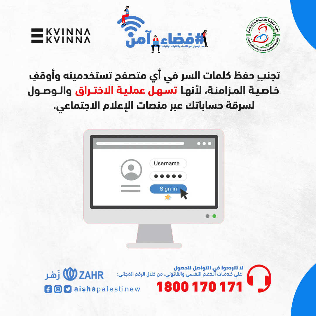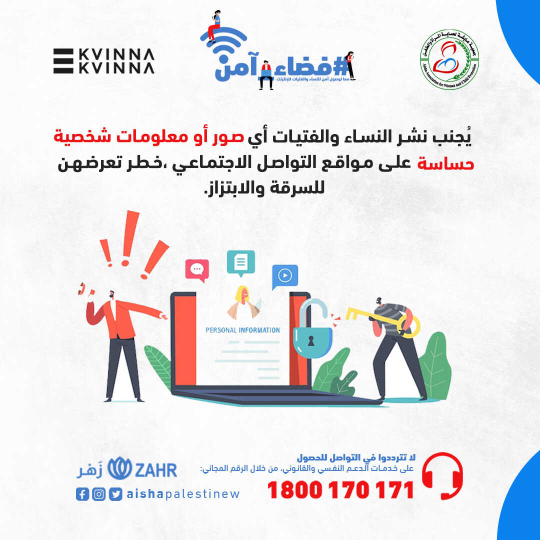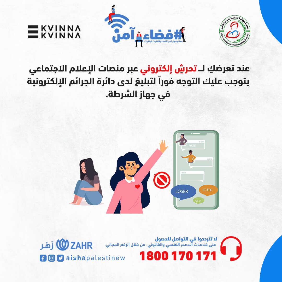 لأن الحقوق الّتي يتمتّع بها الناس خارج نطاق الإنترنت هي ذات الحقوق التي يجب حمايتها داخل نطاق الإنترنت، أطلفنا في جمعية عايشة لحماية المرأة والطفل حملة فضاء آمن ضمن أنشطة مشروع "إشراك الرجال والنساء في معالجة العنف المبني على النوع الاجتماعي والمساواة بين الجنسين في قطاع غزة، بتمويل من Kvinna til Kvinna.